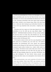 ABSTRAK ASI Eksklusif adalah pemberian ASI kepada bayi selama 0-6 bulan tanpa adanya cairan tambahan dan makanan padat. ASI penting bagi bayi karena ASI mengandung vitamin yang sangat bermanfaat bagi bayi. Tujuan dari penelitian ini adalah untuk mengetahui faktor –faktor yang berhubungan dengan pemberian ASI Eksklusif pada karyawan di Rumah Sakit x Bekasi. Metode penelitan adalah kuantitatif deskriptif korelasi dengan pendekatan cross sectional dengan teknik accidental sampling. Analisis yang digunakan univariat dan bivariat dengan uji Chi-square dengan jumlah sampel 52 wanita memiliki bayi usia 6-18 bulan tahun 2017. Dari hasil univariat yang diperoleh adalah usia 20-35 tahun 44 (84,6 %), paritas multipara 33 ( 63,5 %), pendidikan tinggi 36 ( 69,2 %), pengetahuan cukup 30 ( 57,7 %), dukungan keluarga mendukung 27 (51,9 %), dukungan atasan mendukung 28 ( 53,8 %), dukungan tenaga kesehatan 34 (65,4 %) dan fasilitas cukup 26 (50 %). Hasil bivariatnya menunjukkan hubungan yang signifikan antara pengetahuan dengan pemberian ASI Eksklusif (p = 0,000),dukungan keluarga dengan pemberian ASI Eksklusif (p = 0,000), dukungan atasan dengan pemberian ASI Eksklusif (p =0,020 ), hubungan fasilitas dengan pemberian ASI Eksklusif (p= 0,007 ). Dan tidak ada hubungan antara usia dengan pemberian ASI Eksklusif (p= 0,379 ), hubungan paritas dengan pemberian ASI Eksklusif ( p = 0,897 ), hubungan pendidikan dengan pemberian ASI Eksklusif ( p=0,622 ), serta dukungan tenaga kesehatan dengan pemberian ASI Eksklusif (p= 0,070 ). Kata kunci : usia , paritas, pendidikan, pengetahuan ,dukungan keluarga, dukungan atasan, dukungan tenaga kesehatan , fasilitas dan ASI Eksklusif. Daftar pustaka : 22 buku ( 2009-2016), 10 jurnal (2009-2017) ABSTRACT Exclusive breastfeeding is breastfeeding to infants for 6 months in the absence of additional fluids and no additional solids. Breast milk is very important for babies because breast milk contains many vitamins that are very beneficial to the baby. The purpose of this study was to determine the factors associated with exclusive breastfeeding on employees at Hospital x Bekasi. The research method is quantitatively descriptive correlation with cross sectional approach with accidental sampling technique. The analysis used univariate and bivariate with Chi-square test with sample 52 women have infants aged 6-18 months year 2017. Univariate analysis decumented 44 women (84,6 %) aged 20-35 years , 33 women (63,5%) were multiparous, 36 women (69,2%)underwent higher educationsi, 30women (57,7%) were knowledgable, 27 women (51,9%) gained family support, 28 women (53,8%) obtained superiors support, 34 women (65.4%) received support from healthcare workers and 26 women (50%) were able to access facilities. The bivariate results show a significant relationship between knowledge and exclusive breastfeeding (p = 0,000), family support with Exclusive breastfeeding (p = 0,000), superiors support with Exclusive breastfeeding (p = 0.020), facility relation with Exclusive breastfeeding (p = 0.007). And there is no relationship between age and exclusive breastfeeding (p = 0.379), parity relationship with exclusive breastfeeding (p = 0,897), educational relationship with Exclusive breastfeeding (p = 0,622), and support of health workers with Exclusive breastfeeding = 0.070). Keywords: age, parity, education, knowledge, family support, superior support, support of health workers, facilities and Exclusive Breast Milk. References: 22 books (2009-2016), 10 journals (2009-2017)